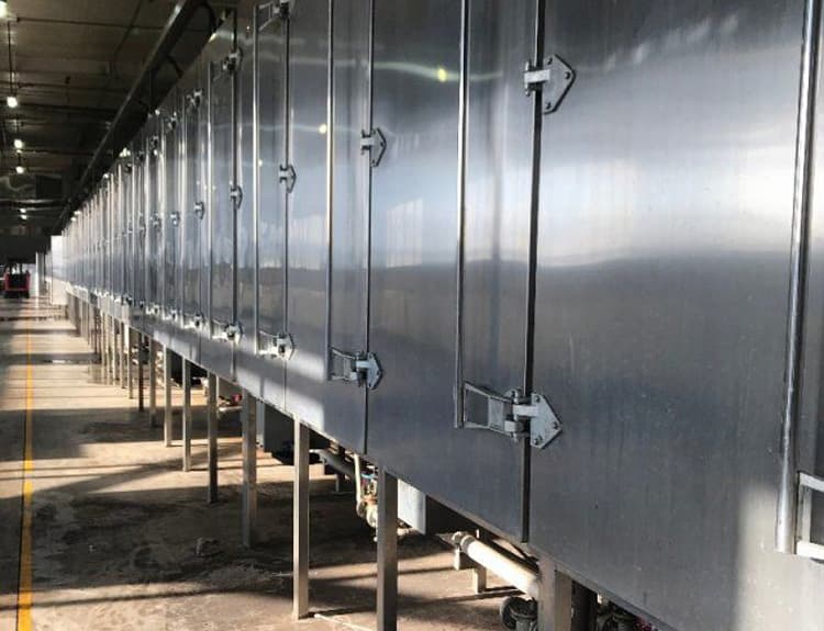 5、 采用合理的斜向導風板,使得網帶橫向布風均勻,溫差小,并使清料更容易。